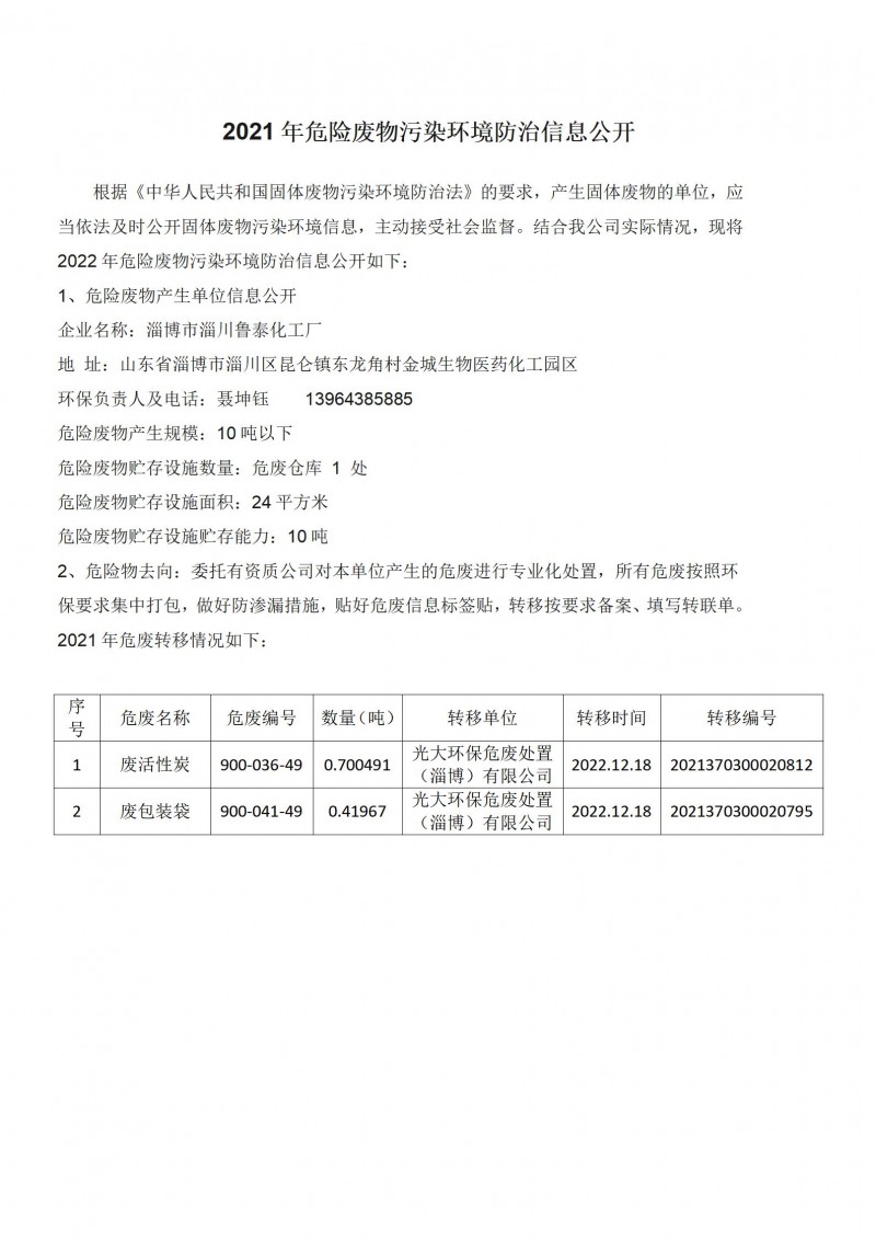 2021年危险废物污染环境防治信息公开